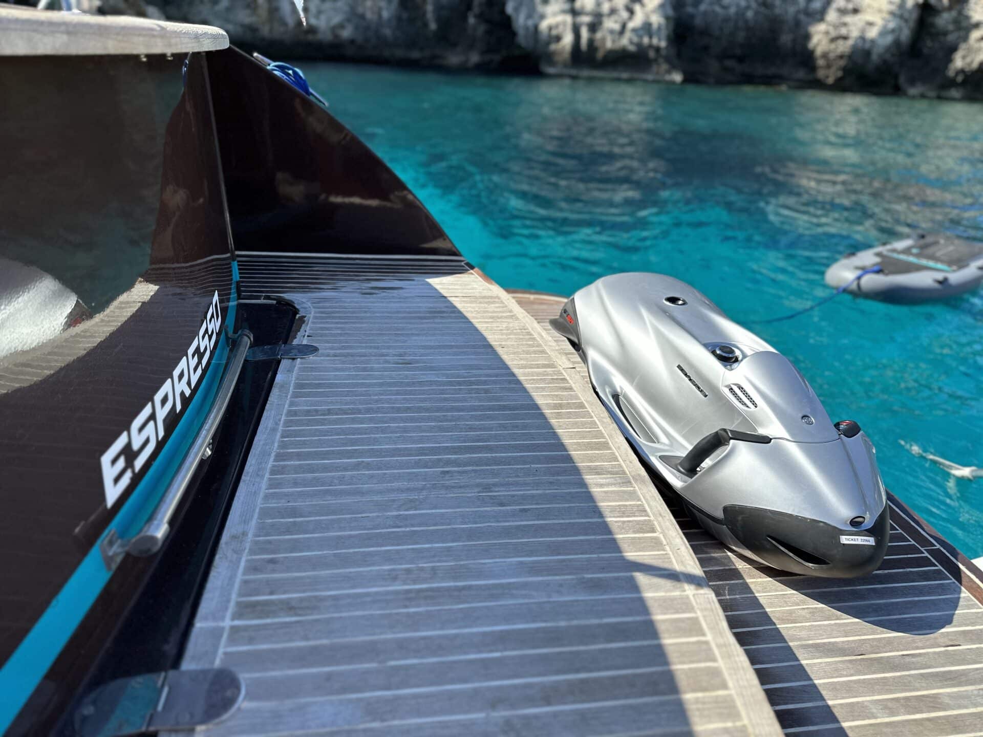 The boat has a generous length of 13m and can carry up to 10 passengers. Equiped with a pair of Volvo Penta D6-350 it has an outstanding cruising performance.